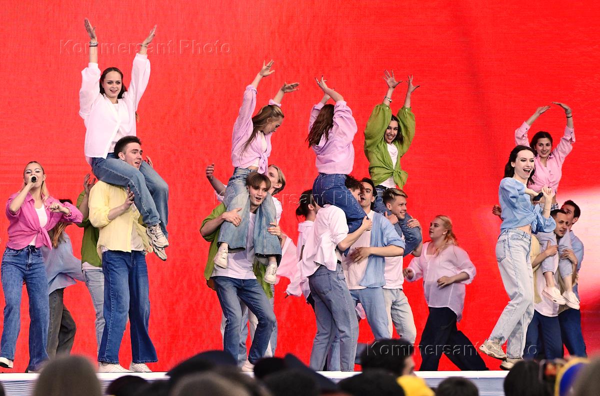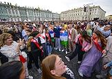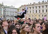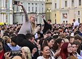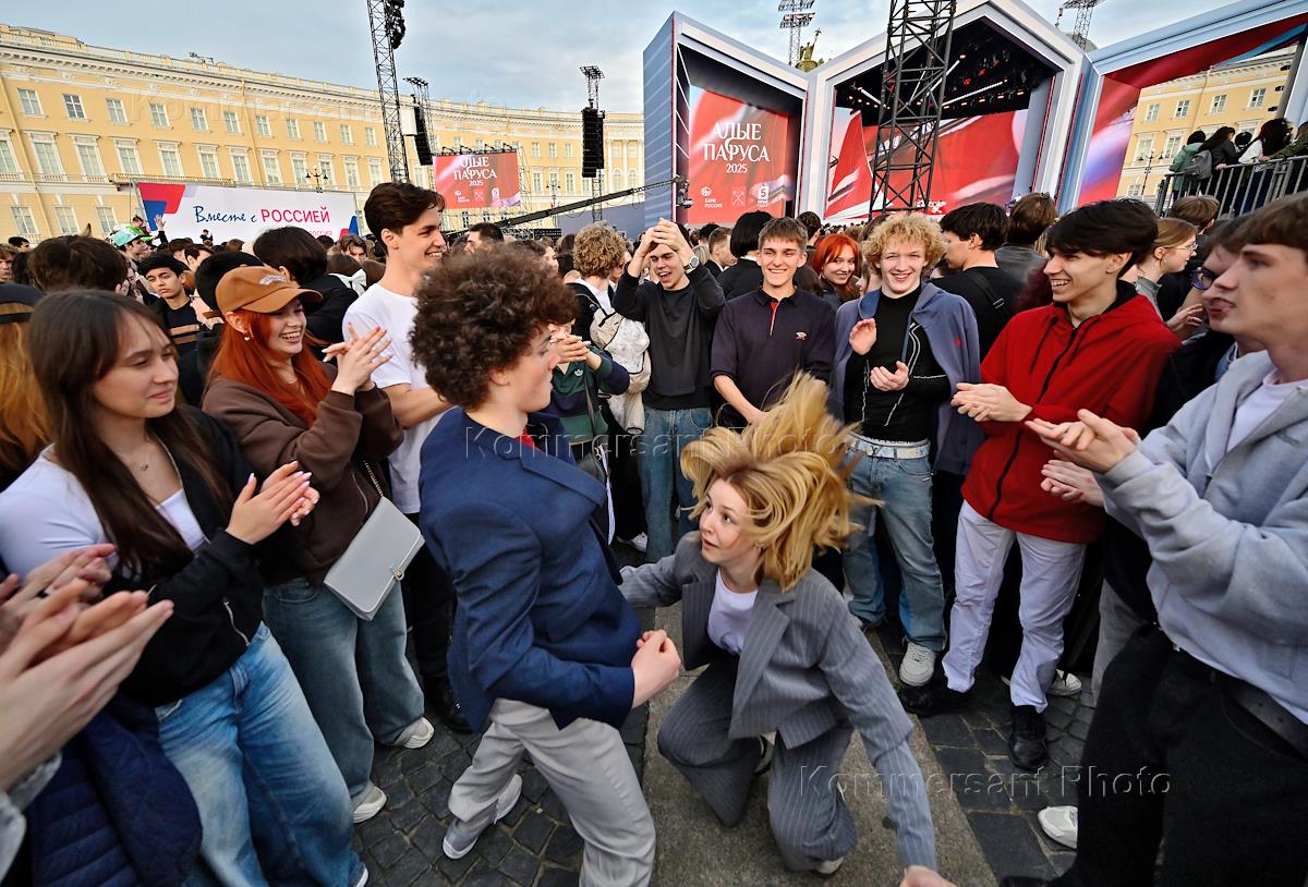 Праздник выпускников средних школ Санкт-Петербурга "Алые паруса 2025". Выпускники во время праздничного концерта на Дворцовой площади.