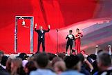 Праздник выпускников средних школ Санкт-Петербурга "Алые паруса- 2025" на Дворцовой площади. Слева направо: губернатор Санкт-Петербурга Александр Беглов, телеведущий Дмитрий Хрусталев и актриса дубляжа Дарья Блохина во время выступления перед выпускниками.