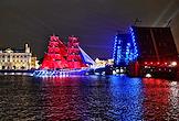 Праздник выпускников средних школ Санкт-Петербурга "Алые паруса- 2025" на Дворцовой площади. Бриг "Россия" в акватории Невы на фоне Дворцовой набережной и Дворцового моста.
