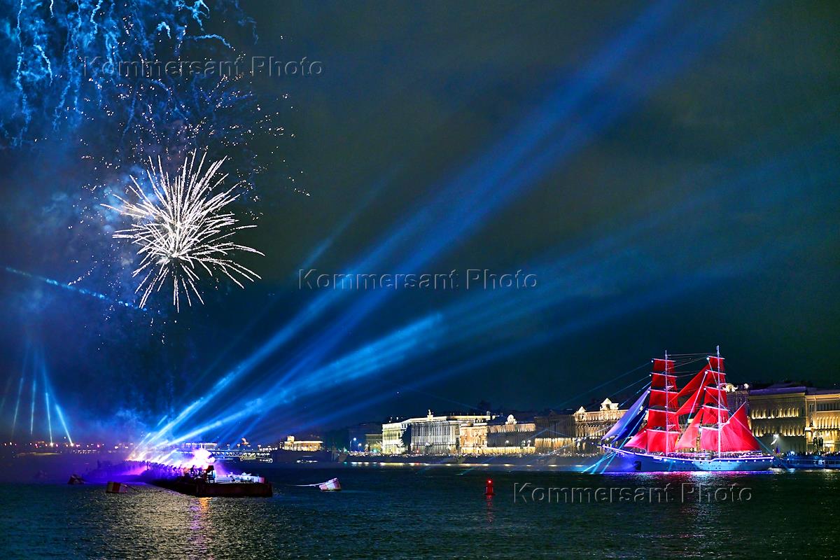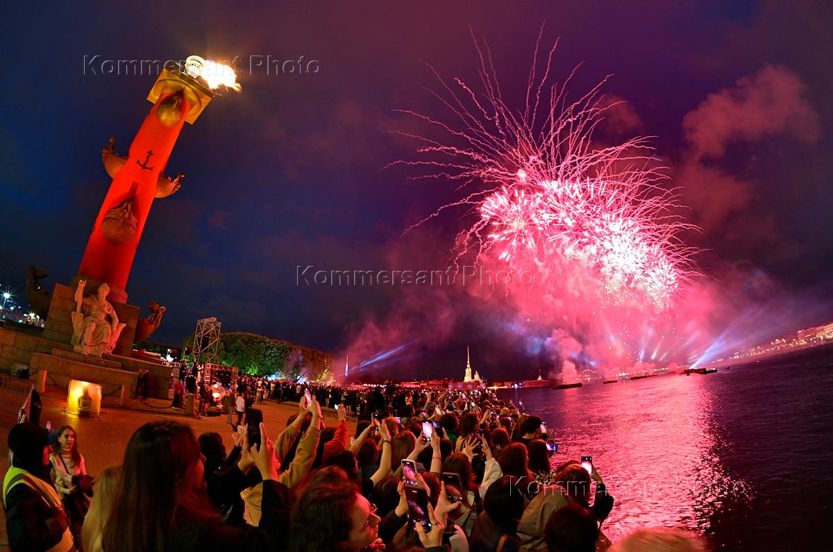Праздник выпускников средних школ Санкт-Петербурга "Алые паруса- 2025" на Дворцовой площади. Фейерверк со Стрелки Васильевского острова.