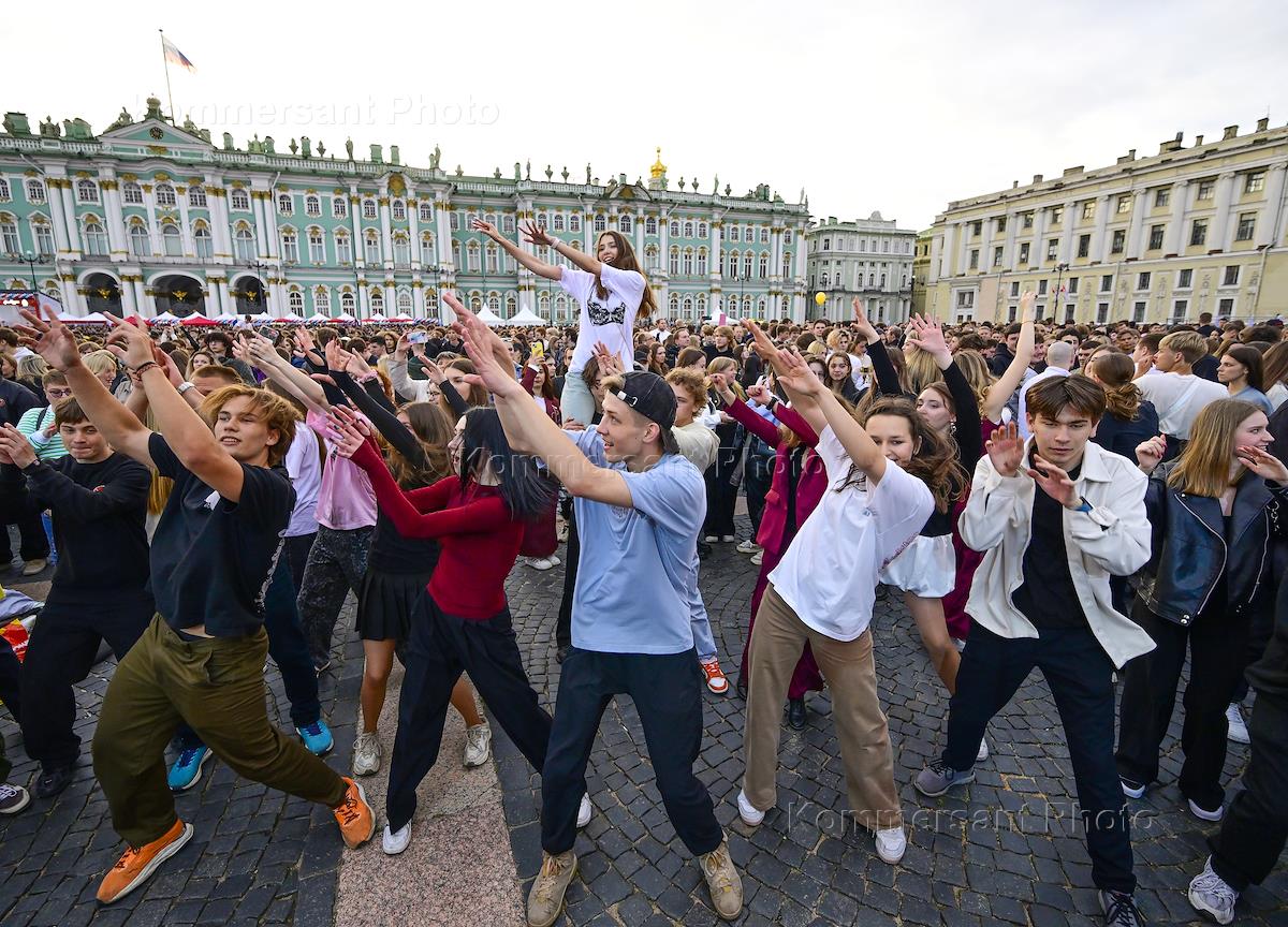 Праздник выпускников средних школ Санкт-Петербурга "Алые паруса 2025". Выпускники во время праздничного концерта на Дворцовой площади.