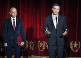 Всероссийский культурно-патриотический проект "Бал Победы", приуроченный к 80-летию Победы в Великой Отечественной войне, в Центральном академическом театре Российской армии. Исполняющий обязанности начальника отдела Департамента культуры Министерства обороны России Олег Савин (слева) и директор Департамента государственной политики в сфере среднего профессионального образования и профессионального обучения Министерства просвещения России Виктор Неумывакин (справа) во время мероприятия.