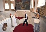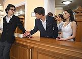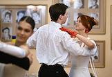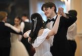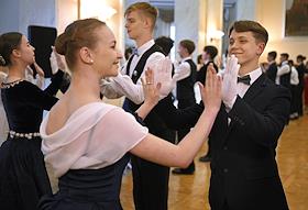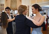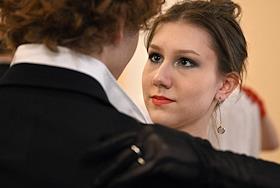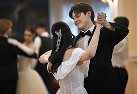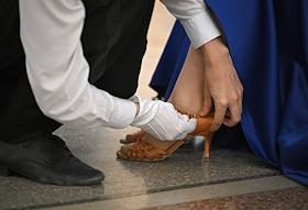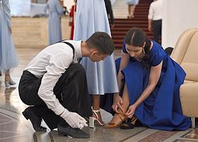 Всероссийский культурно-патриотический проект "Бал Победы", приуроченный к 80-летию Победы в Великой Отечественной войне, в Центральном академическом театре Российской армии. Жанровая фотография. Молодой человек помогает девушке застегнуть ремешок на босоножке.