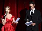 Всероссийский культурно-патриотический проект "Бал Победы", приуроченный к 80-летию Победы в Великой Отечественной войне, в Центральном академическом театре Российской армии. Советник министра просвещения России, президент Союза директоров организаций СПО России Наталья Золотарева (слева) и актер Тимур Еремеев (справа) во время мероприятия.
