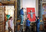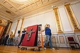Церемония возвращения в постоянную экспозицию Государственного Эрмитажа креста с изображением распятия Христа итальянского художника Уголино ди Тедиче после реставрации. Сотрудники Эрмитажа во время развешивания работы.