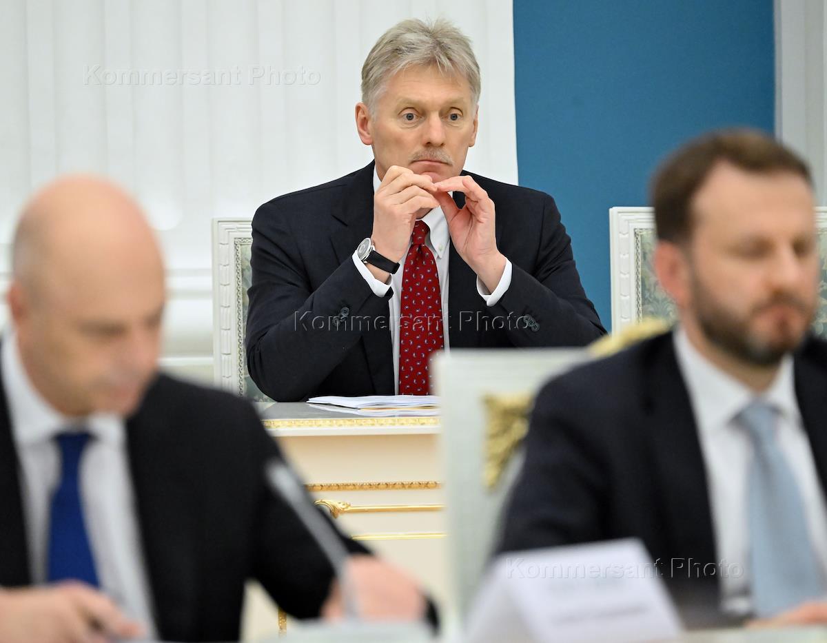 Совещание по вопросам социально-экономического развития ДНР, ЛНР, Запорожской и Херсонской областей в Кремле. Заместитель руководителя администрации президента России, пресс-секретарь президента России Дмитрий Песков (в центре) во время совещания.
