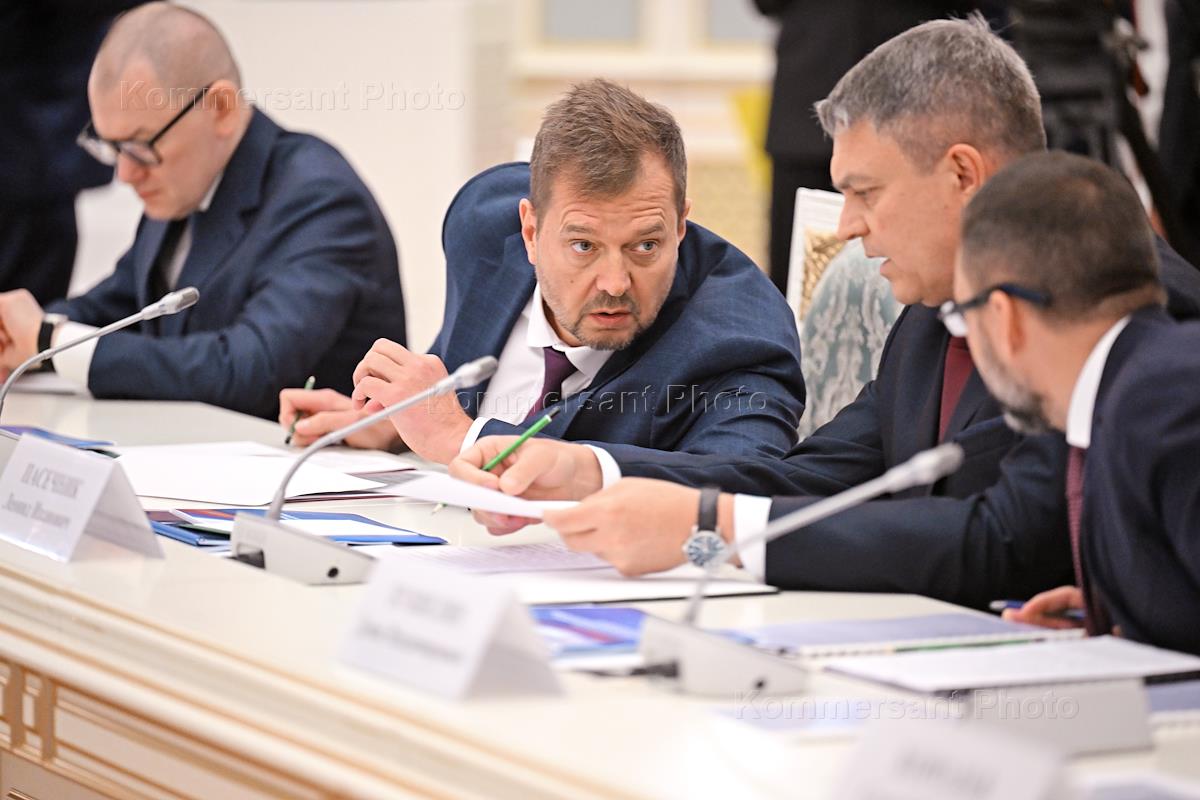 Совещание по вопросам социально-экономического развития ДНР, ЛНР, Запорожской и Херсонской областей в Кремле. Губернатор Запорожской области Евгений Балицкий (второй слева) и глава Луганской Народной Республики Леонид Пасечник (второй справа) во время совещания.