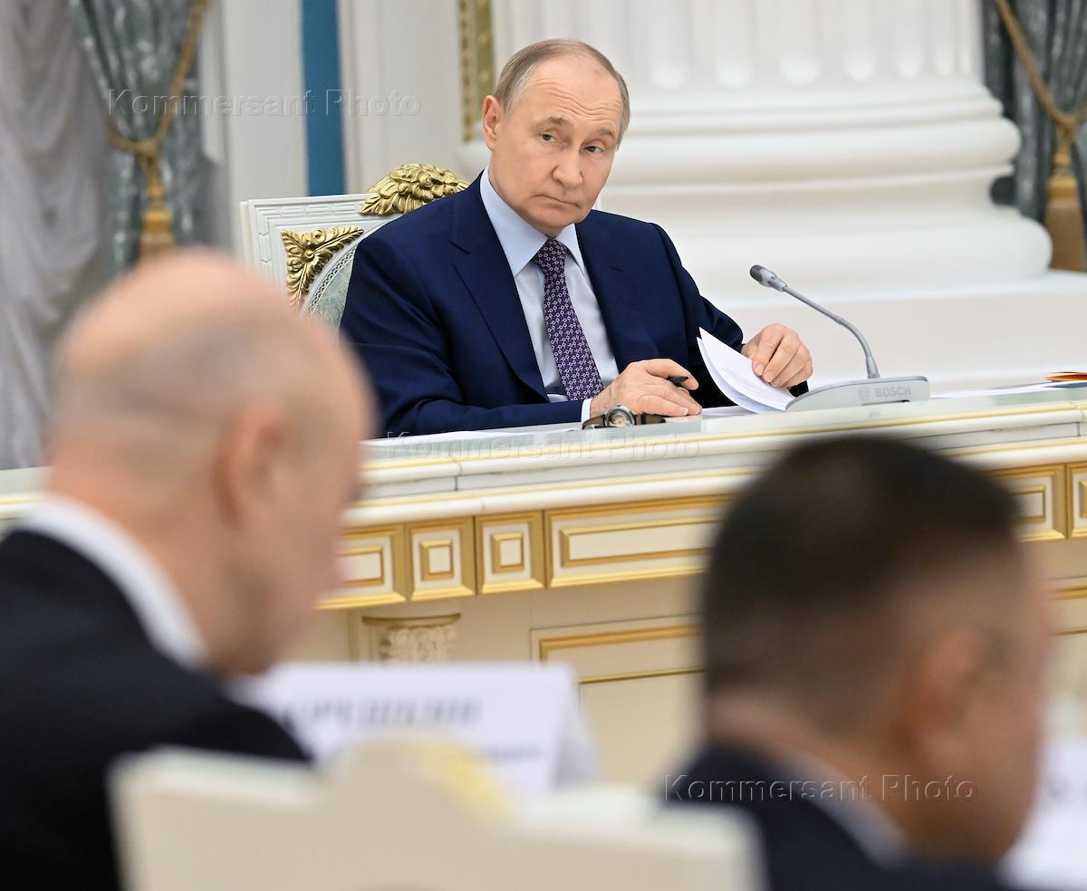 Совещание по вопросам социально-экономического развития ДНР, ЛНР, Запорожской и Херсонской областей в Кремле. Президент России Владимир Путин (второй слева) во время совещания.