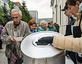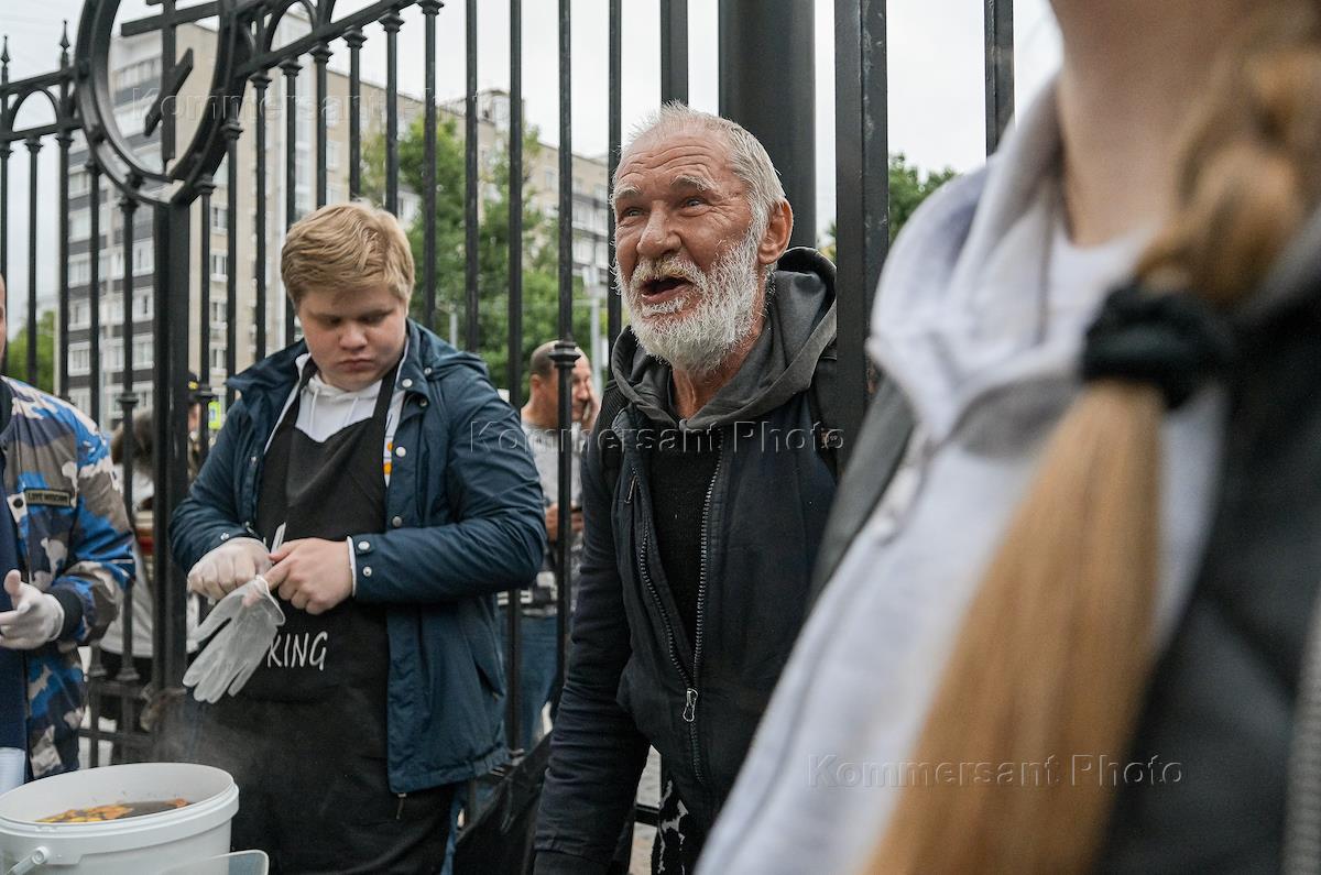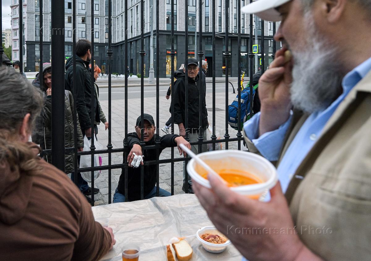 Еженедельный ужин для бездомных, проходящий каждый вторник в храме Флора и Лавра на Зацепе. Бездомный идет получать еду.