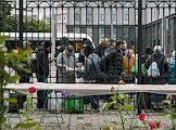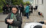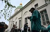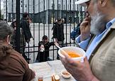 Еженедельный ужин для бездомных, проходящий каждый вторник в храме Флора и Лавра на Зацепе. Бездомные читают газеты в очереди за едой.