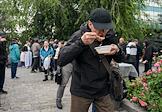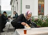 Еженедельный ужин для бездомных, проходящий каждый вторник в храме Флора и Лавра на Зацепе. Бабушка ужинает во дворе храма.