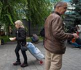 Еженедельный ужин для бездомных, проходящий каждый вторник в храме Флора и Лавра на Зацепе. Бездомные едят около храма.