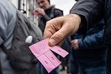 Еженедельный ужин для бездомных, проходящий каждый вторник в храме Флора и Лавра на Зацепе.Талончик для получения ужина из трех блюд в руках бездомного человека.