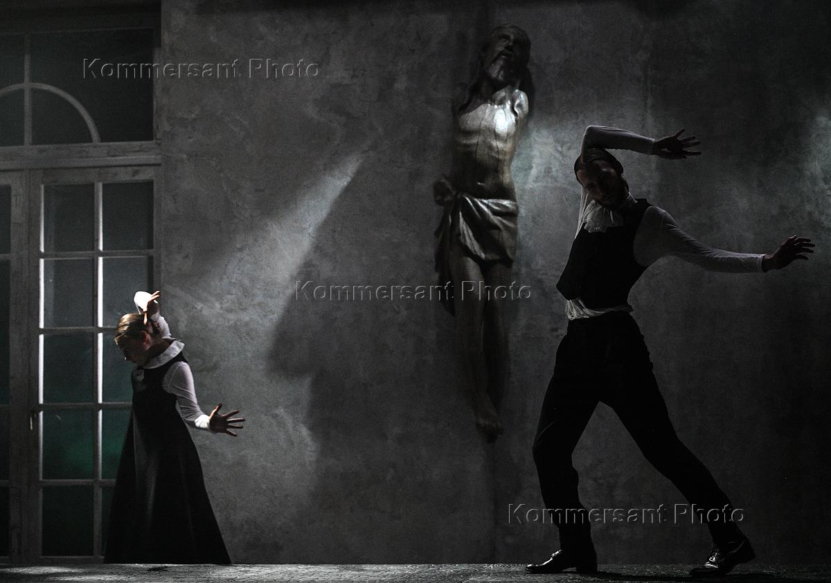 Пресс-показ спектакля "Жюли" по мотивам пьесы Августа Стриндберга "Фрекен "Жюли" в постановке режиссера Джеймса Нобо на сцене Театра Наций. Актеры Александр Новин (справа) и Ольга Лерман (слева) во время спектакля.