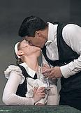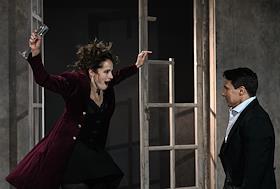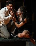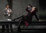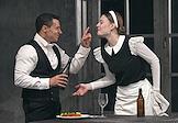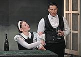 Пресс-показ спектакля "Жюли" по мотивам пьесы Августа Стриндберга "Фрекен "Жюли" в постановке режиссера Джеймса Нобо на сцене Театра Наций. Актеры Александр Новин (слева) и Ольга Лерман (справа) во время спектакля.