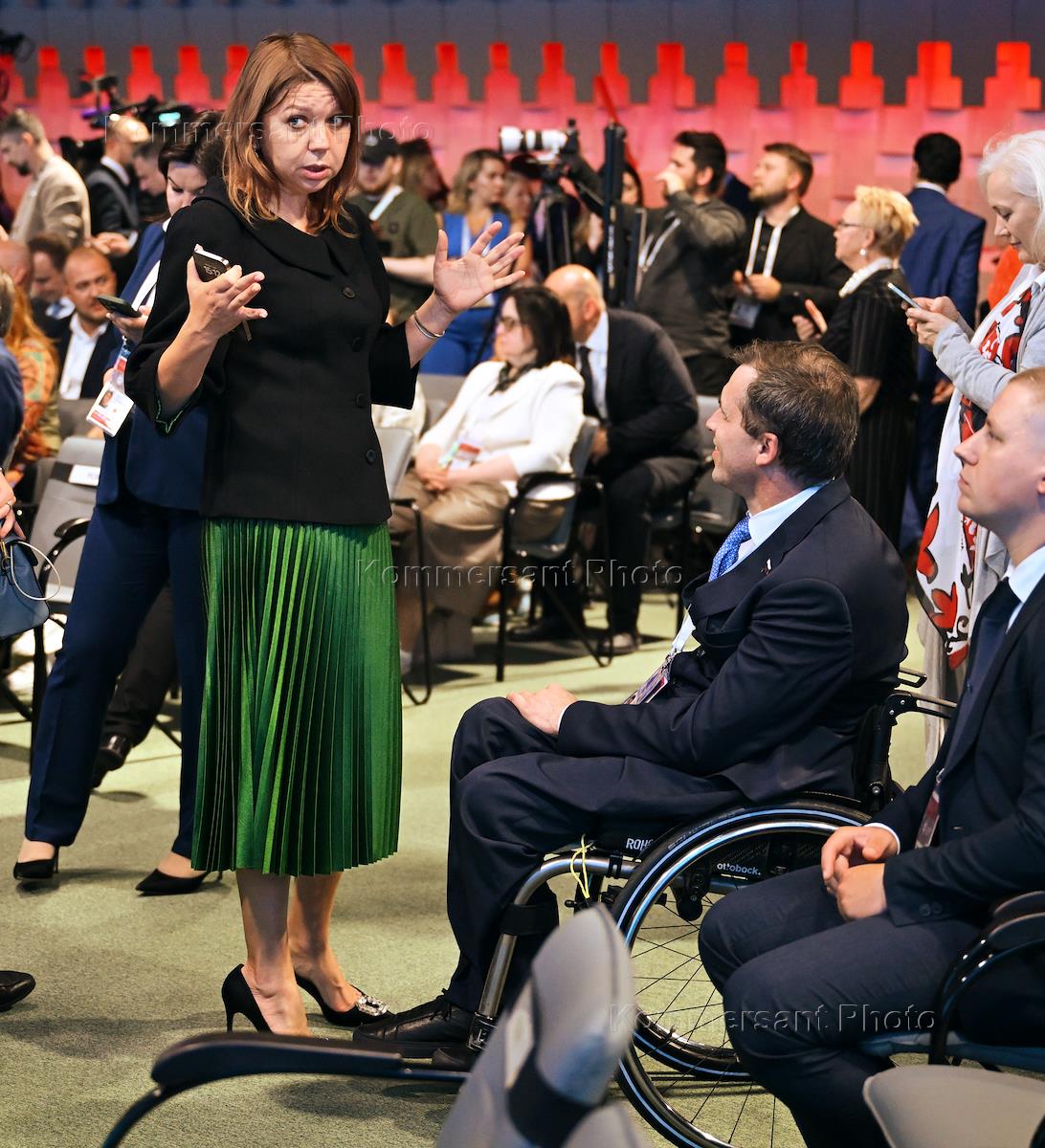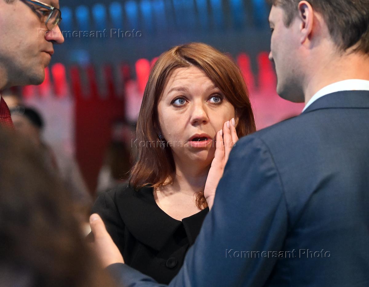 Форум "Сильные идеи для нового времени" в Национальном центре "Россия". Первый заместитель председателя комитета Государственной думы России по экономической политике Денис Кравченко (слева) и генеральный директор Национального центра "Россия" Наталья Виртуозова (в центре) перед началом пленарного заседания форума.