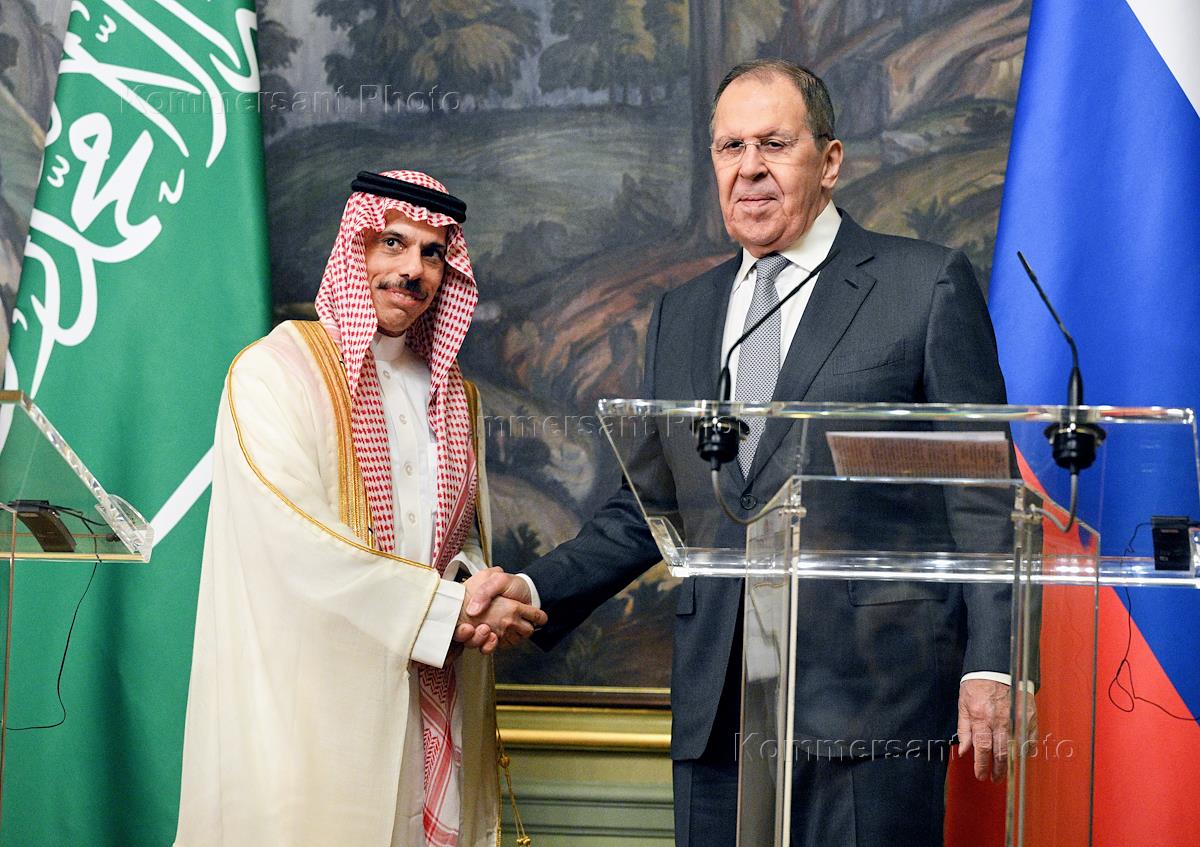 Переговоры министра иностранных дел России Сергея Лаврова с министром иностранных дел Королевства Саудовская Аравия Фейсалом Бен Фарханом Аль Саудом в Доме приемов МИД России. Министр иностранных дел Королевства Саудовская Аравия Фейсал Бен Фархан Аль Сауд (справа) и министр иностранных дел России Сергей Лавров (слева) перед началом пресс-конференции по итогам переговоров.