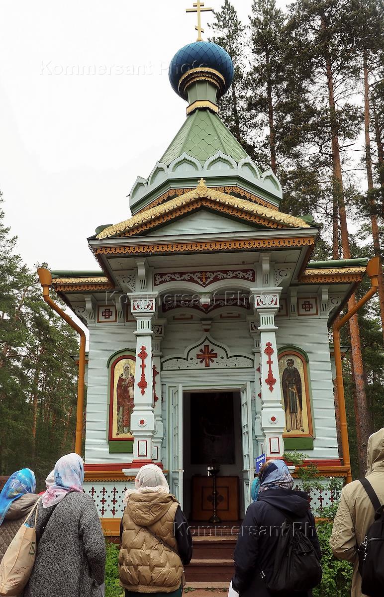 Коневский Рождество-Богородичный мужской монастырь. Жанровая фотография. Верующие на фоне настенной росписи Святых ворот - выбор преподобным Арсением места для строительства нового храма.