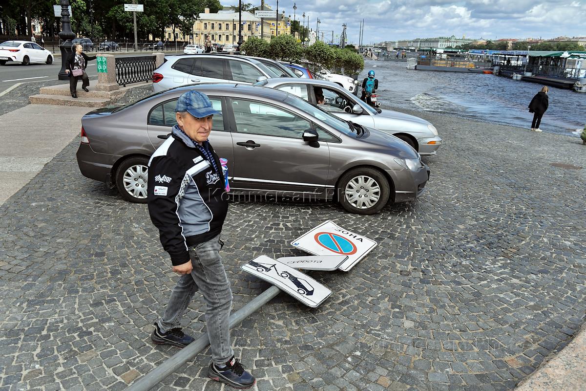 Последствия шторма в Санкт-Петербурге. Наводнение на Университетской набережной. Упавшие от ветра временные дорожные знаки.