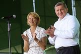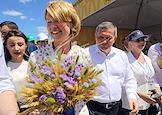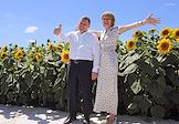Агровыставка "Всероссийский день поля 2025" на территории крестьянского (фермерского) хозяйства (КФХ) Чердынцев. Министр сельского хозяйства России Оксана Лут (справа) и губернатор Волгоградской области Андрей Бочаров (слева) на фоне поля Подсолнечника Донского 22.