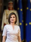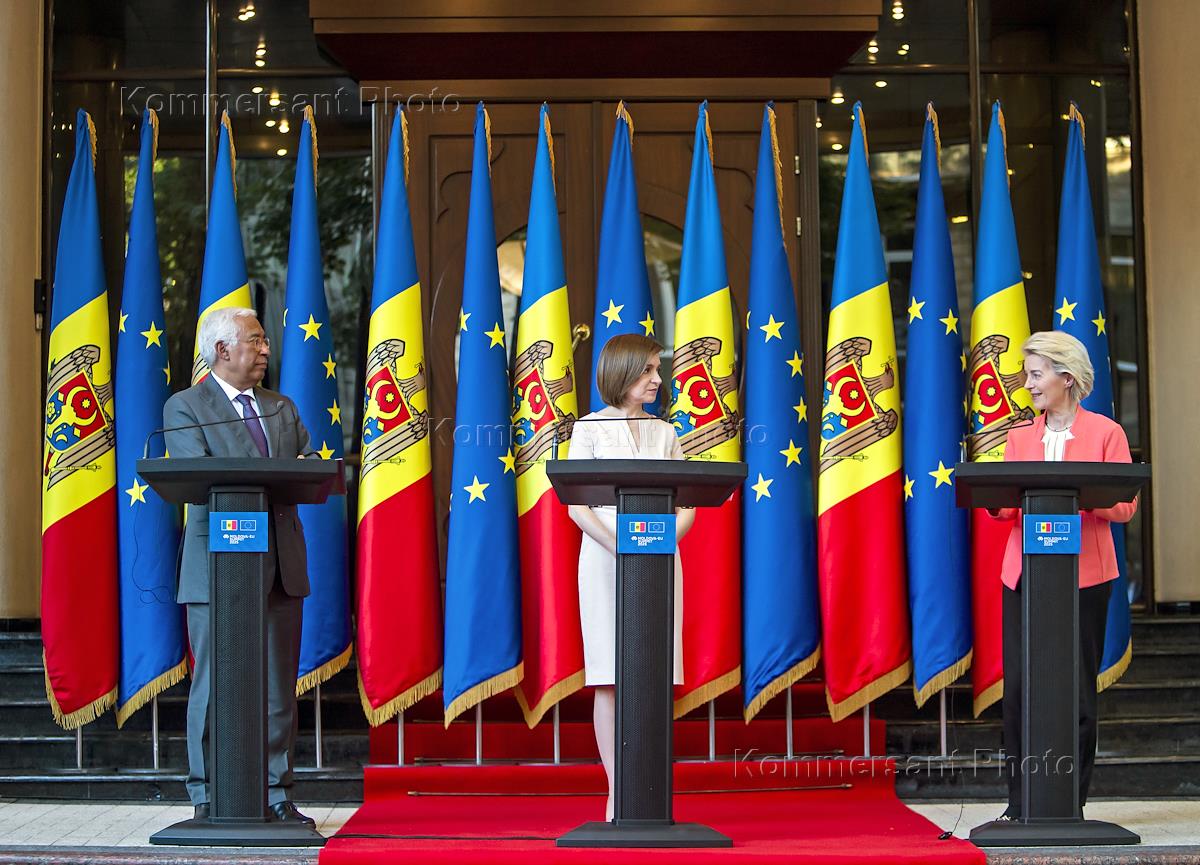 Первый саммит Европейский Союз (ЕС) — Молдавия в резиденции президента Молдавии. Слева направо: председатель Европейского совета Антониу Кошту, президент Молдавии Майя Санду и председатель Европейской комиссии Урсула фон дер Ляйен во время саммита.