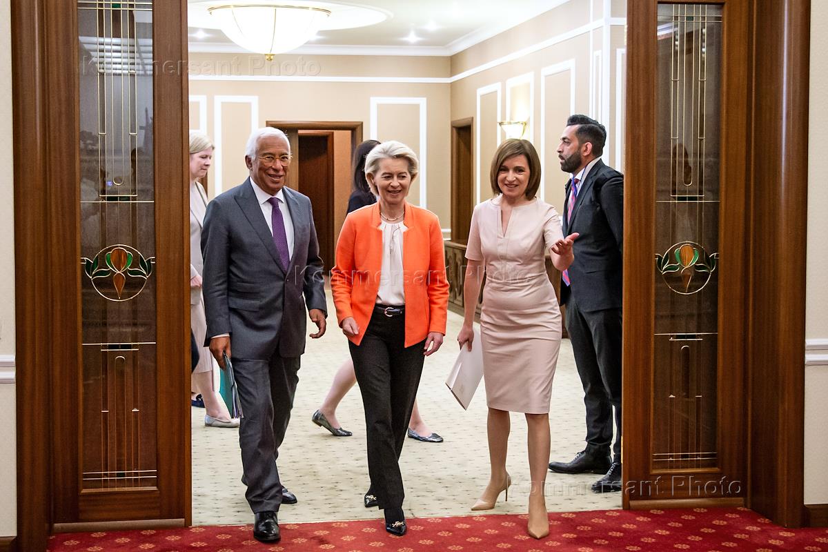 Первый саммит Европейский Союз (ЕС) — Молдавия в резиденции президента Молдавии. Слева направо: председатель Европейского совета Антониу Кошту, председатель Европейской комиссии Урсула фон дер Ляйен и президент Молдавии Майя Санду во время саммита.