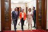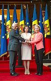 Первый саммит Европейский Союз (ЕС) — Молдавия в резиденции президента Молдавии. Президент Молдавии Майя Санду (вторая справа), председатель Европейской комиссии Урсула фон дер Ляйен (слева) и председатель парламента Республики Молдова Игорь Гросу (в центре) во время саммита.