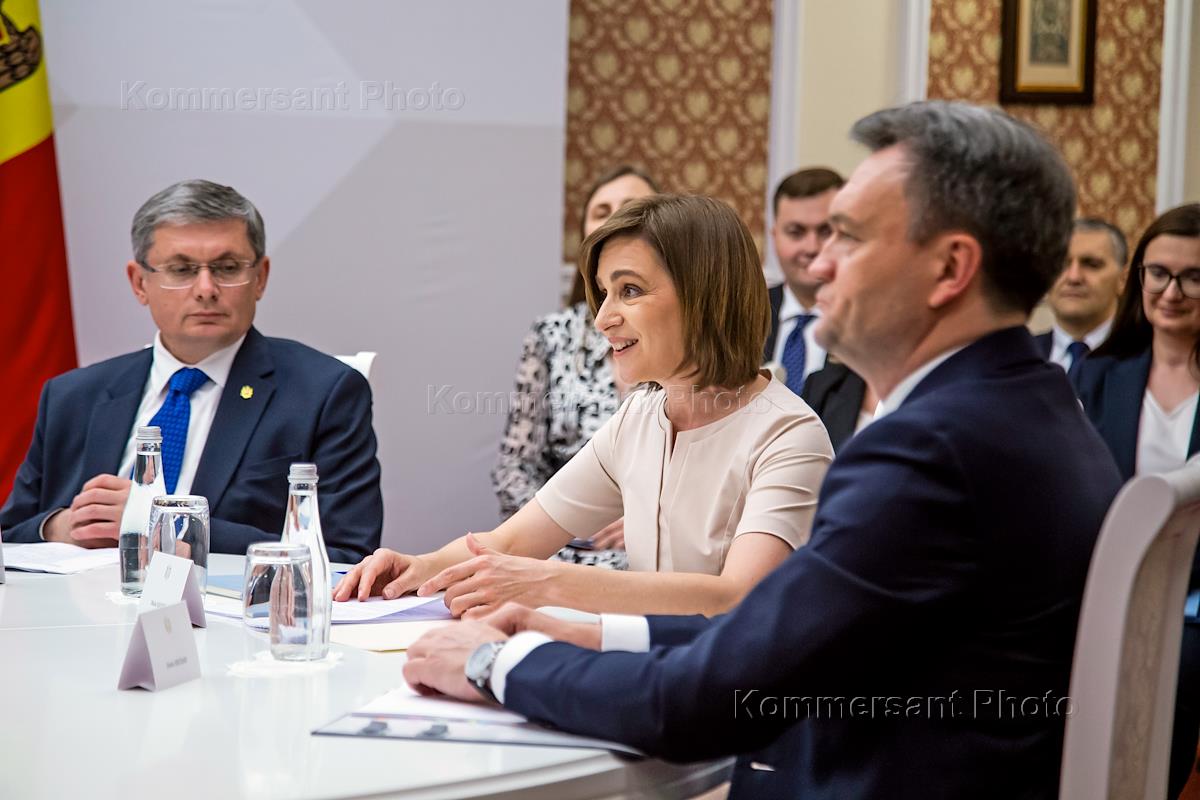 Первый саммит Европейский Союз (ЕС) — Молдавия в резиденции президента Молдавии. Президент Молдавии Майя Санду (в центре) и председатель парламента Республики Молдова Игорь Гросу (слева) во время саммита.