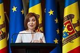 Первый саммит Европейский Союз (ЕС) — Молдавия в резиденции президента Молдавии. Слева направо: председатель Европейского совета Антониу Кошту, президент Молдавии Майя Санду и председатель Европейской комиссии Урсула фон дер Ляйен во время пресс-конференции.