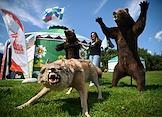Московский общегородской праздник "Сабантуй-2025" на территории Музея-заповедника "Коломенское". Жанровая фотография. Чучела медведей и волка у юрты "Тирмэ" на площадке "Башкирская деревня".