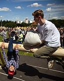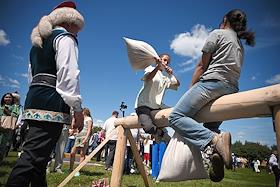 Московский общегородской праздник "Сабантуй-2025" на территории Музея-заповедника "Коломенское". Жанровая фотография. Гости праздника во время битвы мешками на бревне на площадке "Башкирская деревня".