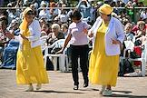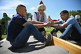Московский общегородской праздник "Сабантуй-2025" на территории Музея-заповедника "Коломенское". Жанровая фотография. Гости праздника во время участия в народных играх на площадке "Башкирская деревня".