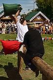 Московский общегородской праздник "Сабантуй-2025" на территории Музея-заповедника "Коломенское". Жанровая фотография. Гости праздника во время битвы мешками на бревне на площадке "Татарская деревня".