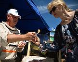 Московский общегородской праздник "Сабантуй-2025" на территории Музея-заповедника "Коломенское". Жанровая фотография. Гости праздника во время дегустации меда на площадке "Башкирская деревня".