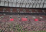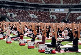 День Московского спорта на территории Олимпийского комплекса "Лужники". Гимнастка Самира Мустафаева (в центре) во время фитнес-тренировки.