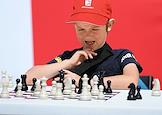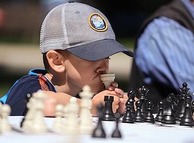 День Московского спорта на территории Олимпийского комплекса "Лужники". Мальчик во время игры в шахматы.