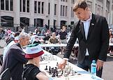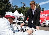 День Московского спорта на территории Олимпийского комплекса "Лужники". Гроссмейстер, президент Федерации шахмат Московской области Сергей Карякин (справа) во время сеанса одновременной игры в шахматы.