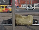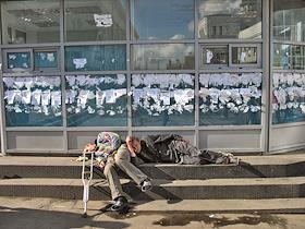 Пьяные мужчины спят на лестнице у торговых павильонов.