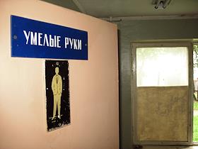 Жанровое фото. Табличка "умелые руки" на двери мужского туалета.