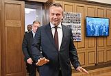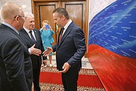 Пленарное заседание Государственной думы (ГД) России. Слева направо: председатель комитета ГД России по контролю Олег Морозов, председатель комитета ГД России по транспорту и развитию транспортной инфраструктуры Евгений Москвичев и министр транспорта России Андрей Никитин после заседания.