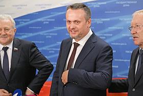 Пленарное заседание Государственной думы (ГД) России. Слева направо: председатель комитета ГД России по транспорту и развитию транспортной инфраструктуры Евгений Москвичев, министр транспорта России Андрей Никитин и председатель комитета ГД России по контролю Олег Морозов после заседания.