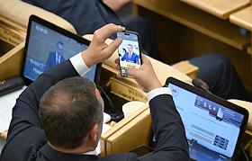 Пленарное заседание Государственной думы (ГД) России. Член комитета ГД России по охране здоровья Андрей Горохов (слева) во время заседания.
