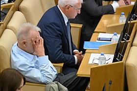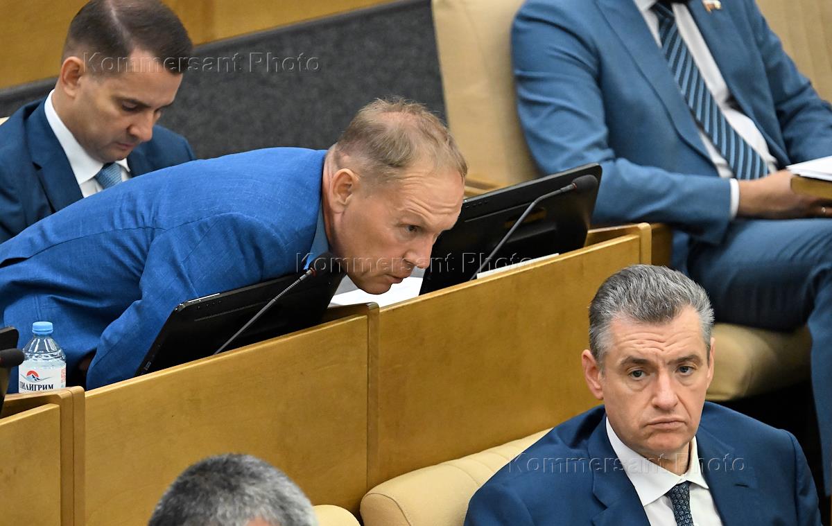 Пленарное заседание Государственной думы (ГД) России. Слева направо: председатель комитета ГД России по труду, социальной политике и делам ветеранов Ярослав Нилов, первый заместитель председателя комитета ГД России по безопасности и противодействию коррупции Андрей Луговой и председатель Либерально-демократической партии России (ЛДПР), руководитель фракции ЛДПР в ГД России Леонид Слуцкий во время заседания.