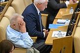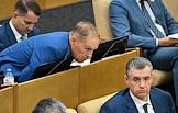 Пленарное заседание Государственной думы (ГД) России. Первый заместитель председателя комитета ГД России по культуре Денис Майданов (слева)и член комитета ГД России по строительству и жилищно-коммунальному хозяйству Александр Якубовский во время заседания.