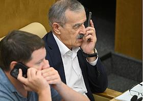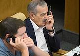 Пленарное заседание Государственной думы (ГД) России. Заместитель председателя комитета ГД России по просвещению Нурбаганд Нурбагандов (справа) во время заседания.