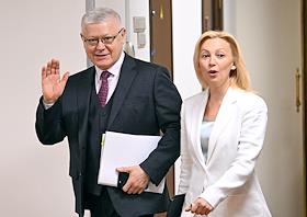 Пленарное заседание Государственной думы (ГД) России. Председатель комитета ГД России по безопасности и противодействию коррупции Василий Пискарев (слева) и председатель комитета ГД России по развитию гражданского общества, вопросам общественных и религиозных объединений Ольга Тимофеева перед началом заседания.