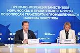 Заместитель мэра Москвы в правительстве Москвы по вопросам транспорта и промышленности, руководитель департамента транспорта и развития дорожно-транспортной инфраструктуры города Москвы Максим Ликсутов (слева) и советник заместителя мэра Москвы в правительстве Москвы по вопросам транспорта и промышленности, заместитель начальника Московского метрополитена Юлия Темникова во время пресс-конференции в МИА "Россия сегодня".