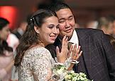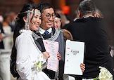 II Всероссийский свадебный фестиваль "Россия. Соединяя сердца" в Национальном центре "Россия". Первый заместитель главы администрации президента России Сергей Кириенко (слева), молодожены из Красноярского края Диана Доонова (третья справа), Александр Васильковский (справа) и герой СВО Валерий Доонов (второй справа) во время фестиваля. Президент России Владимир Путин, узнав о желании Дианы Дооновой увидеть на свадьбе своего брата-героя СВО, отпустил его в отпуск на бракосочетание.