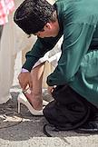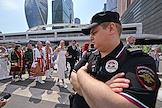II Всероссийский свадебный фестиваль "Россия. Соединяя сердца" в Национальном центре "Россия". Жанровая фотография. Участник театрализованного шествия на фоне башен ММЦД "Москва-Сити".