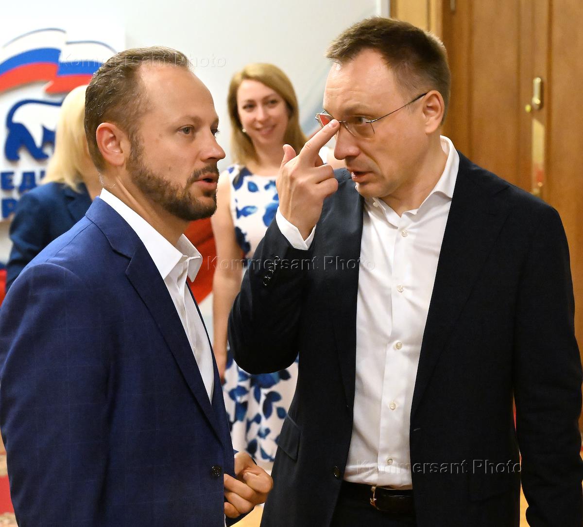 Заседание президиума фракции партии "Единая Россия" в Государственной думе (ГД) России. Член комитета ГД России по государственному строительству и законодательству Дмитрий Вяткин (слева) и министр здравоохранения России Михаил Мурашко (справа) перед началом заседания.
